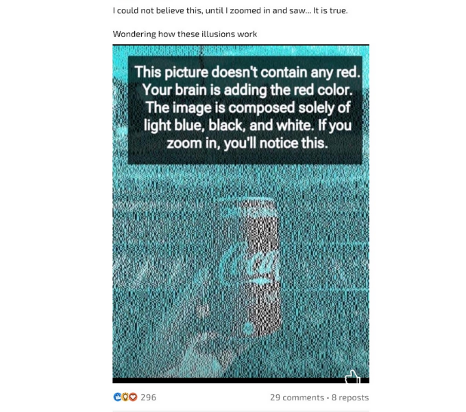 Our mind insists on seeing red, because Coca-Cola is always red. Memory and expectation override raw vision.